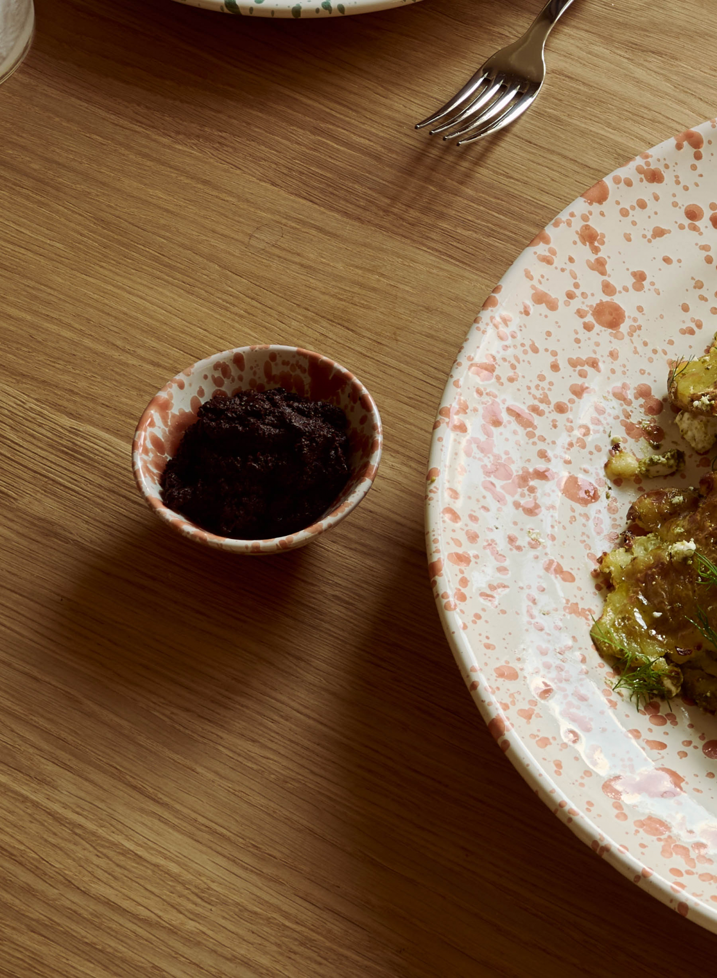 "Spruzzi" is an Italian word that means "splashes" in Swedish. Splatter-painted ceramics are a craft tradition typical of the Puglia region in Italy. This technique involves randomly splashing paint onto the ceramics to give it a unique and individual character. The traditional technique has become an important part of the region's cultural heritage and represents a long history of ceramic production in the area.