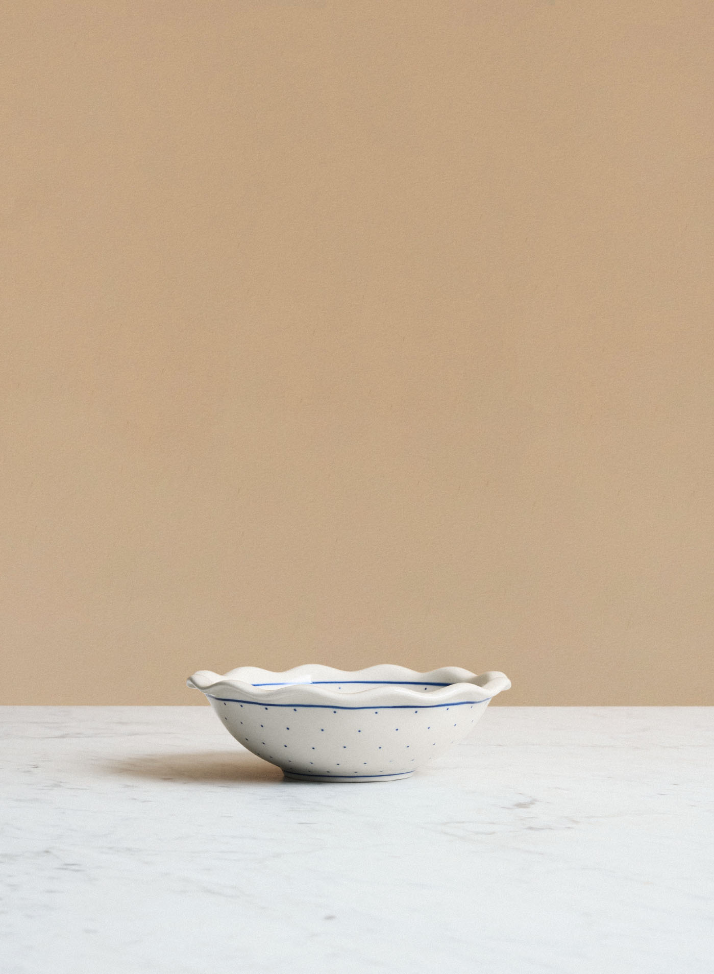 The hand-painted polka dot design combined with the playful wavy rim gives the bowl a decorative and personal expression, making it a lovely addition to the table. Each bowl is unique and reflects the traditional craftsmanship behind it.