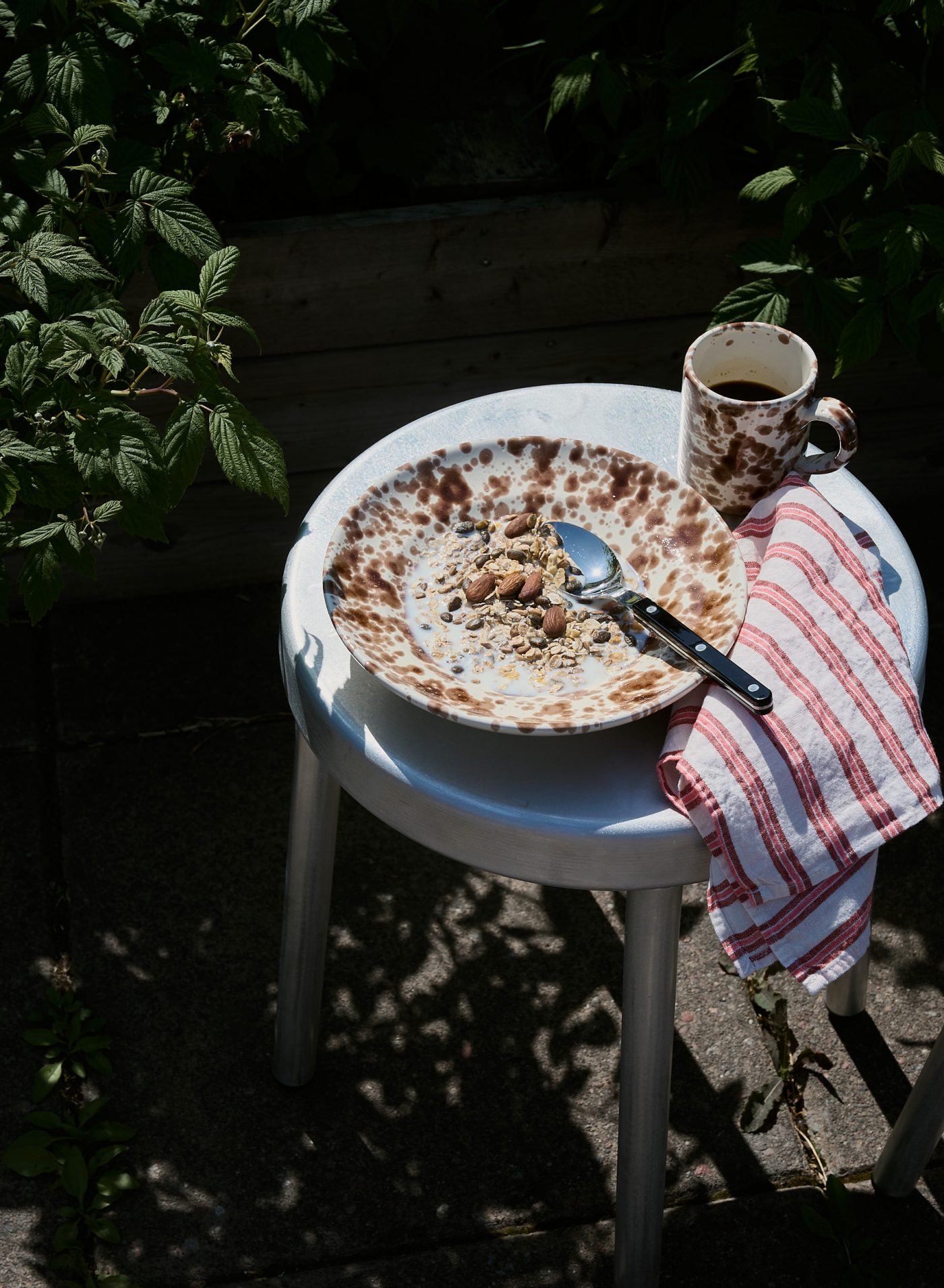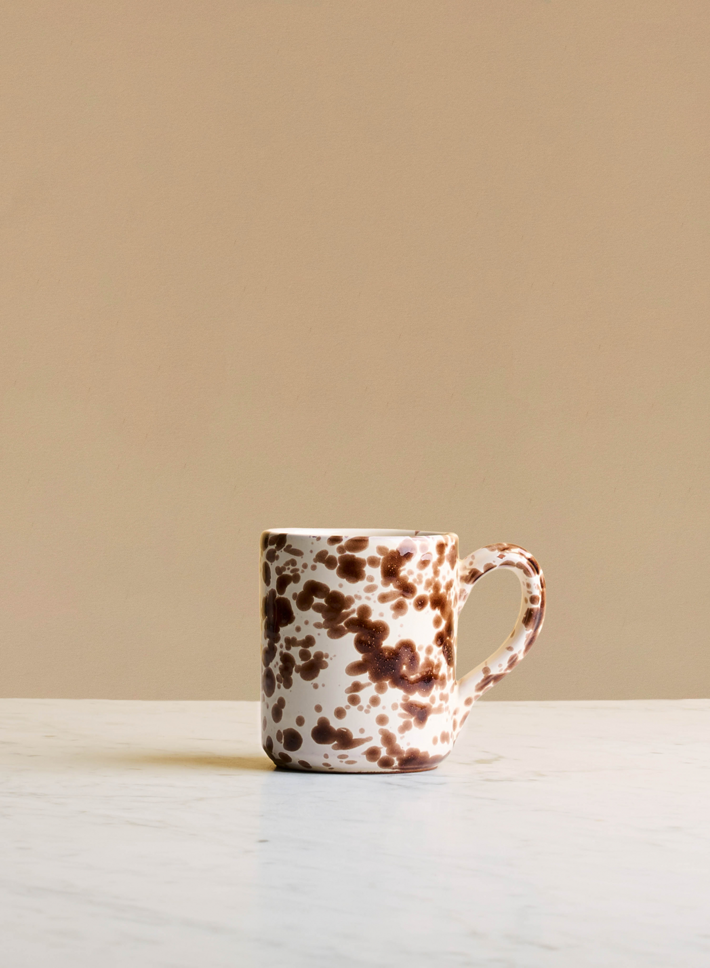 "Spruzzi" is an Italian word meaning "splash" in English. Splatter-painted ceramics is a craft tradition typical of the Puglia region in Italy. This technique involves randomly splashing color onto the ceramic surface, giving it a unique and individual character. The traditional technique has become an important part of the region's cultural heritage, representing a long history of ceramic production in the area. Spruzzi Cioccolato is splatter-painted in a warm brown shade, giving every table setting a lively yet earthy and decorative character.