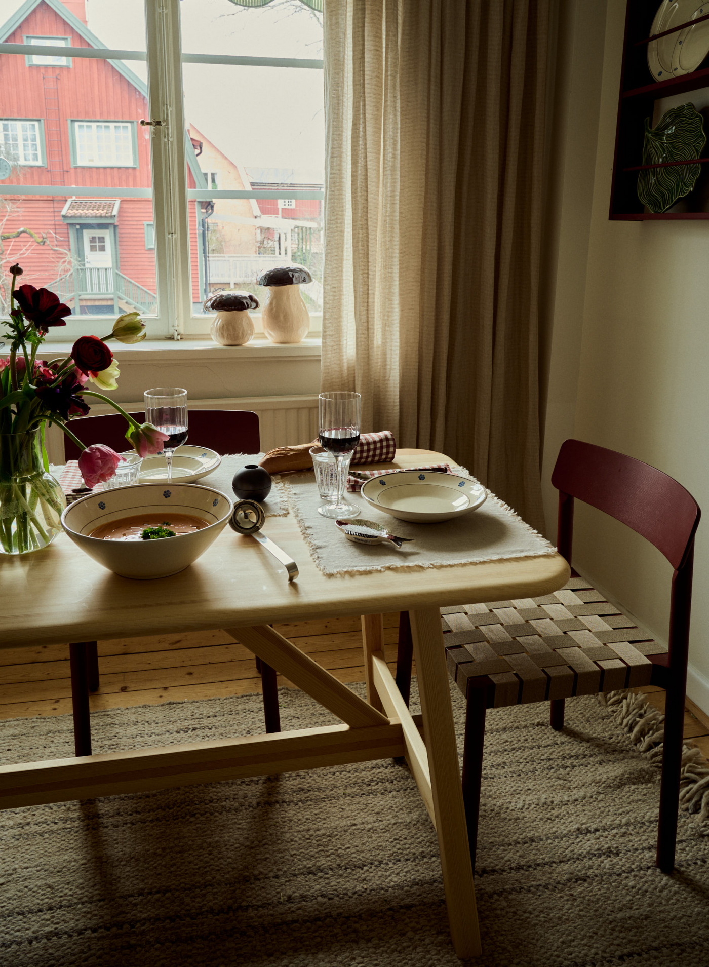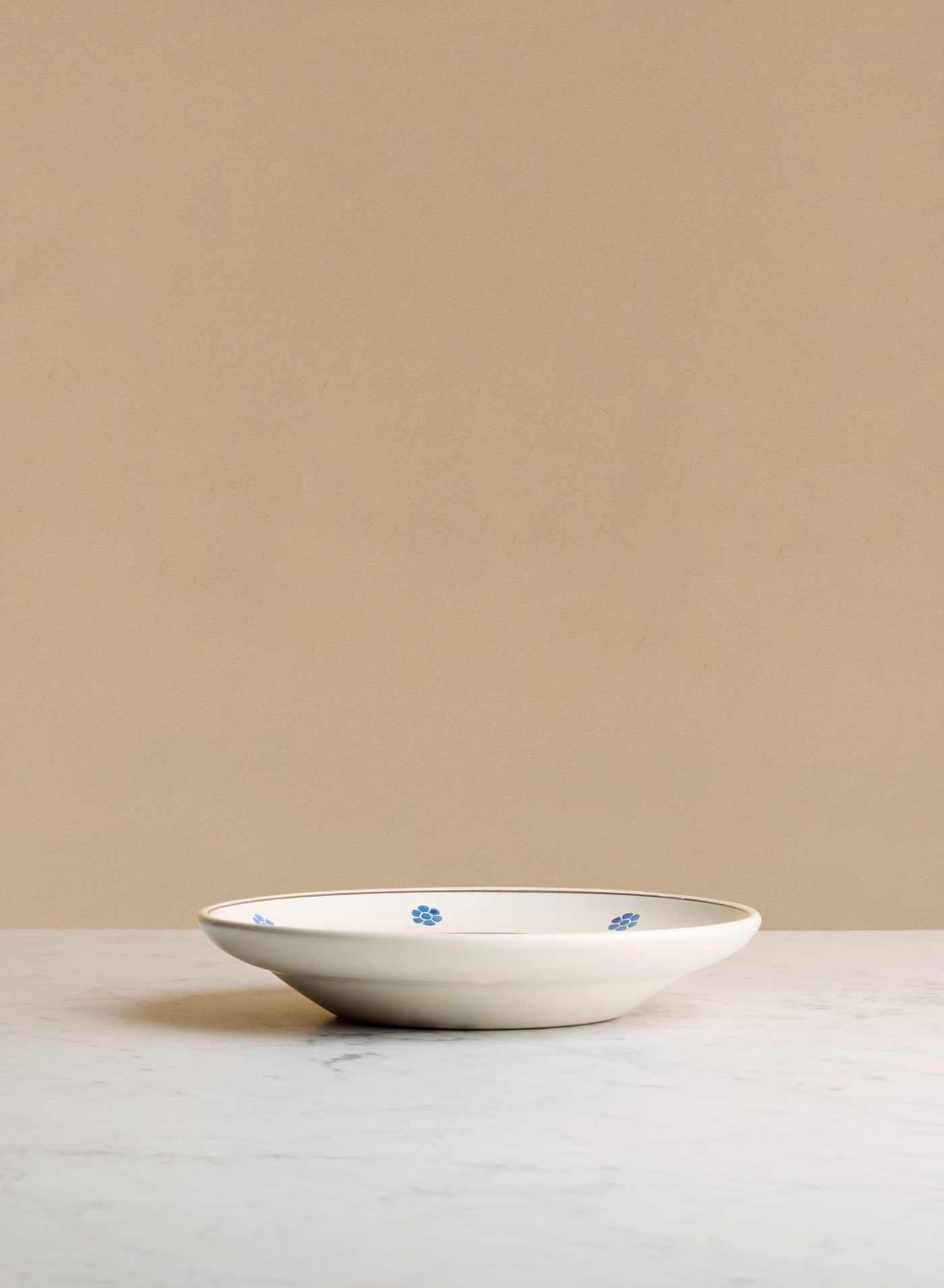 The lines are painted by placing the ceramic on a rotating plate, controlled by a foot pedal, where light brush strokes create delicate lines while the plate rotates. The blue flowers are applied individually with a small stamp. This creates variations that make each detail special. Each plate is unique, with each brushstroke adding a personal touch and creating variations in the design.