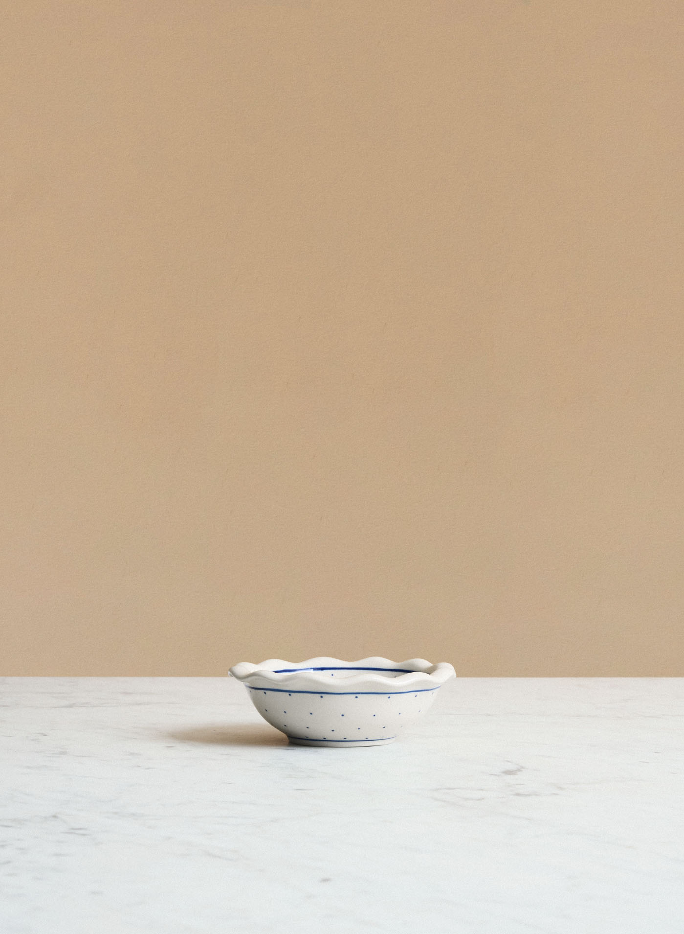 A charming stoneware dessert bowl from the Polish brand Ceramika Artystyczna, known for its craftsmanship and hand-painted designs. The classic polka dot pattern gives the bowl a playful and timeless appearance.