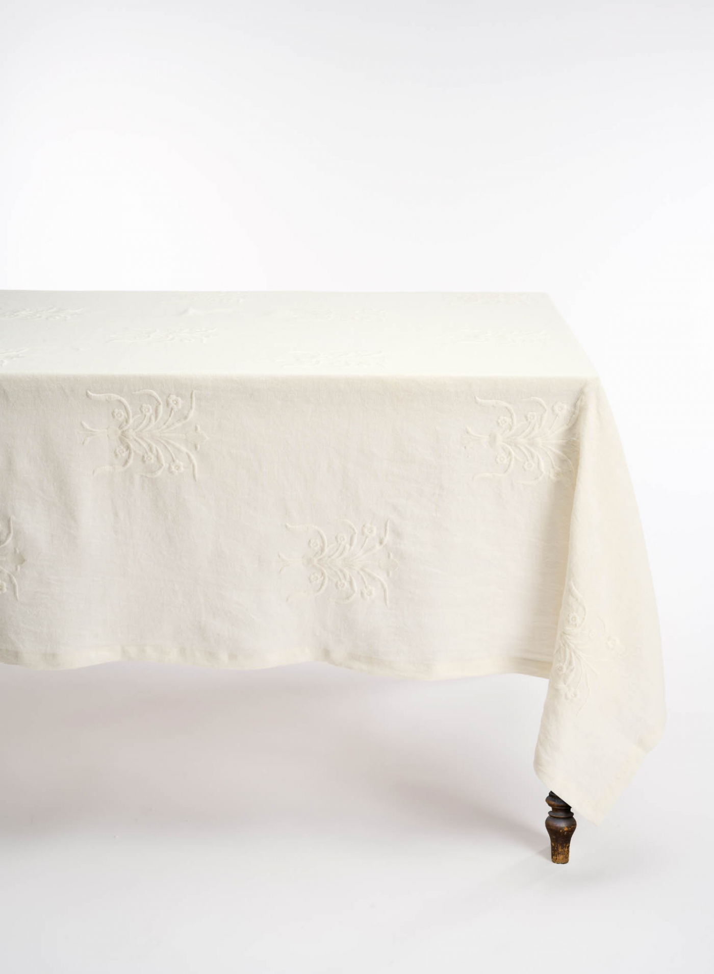 The Floral tablecloth brings warmth and elegance to both everyday meals and celebratory gatherings. Its understated design and embroidered floral detail make it a versatile and enduring piece to use season after season.