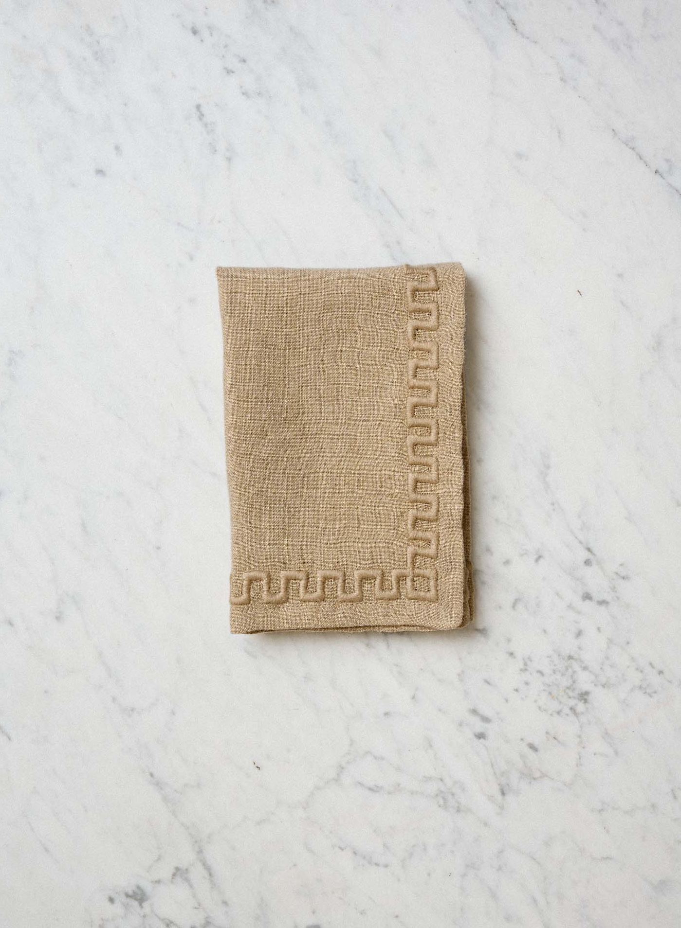 The Frame napkin in beige linen from Cappelen Dimyr is crafted from 100% linen and finished with a discreet, embroidered border featuring a classic Greek meander pattern. The tactile embroidery adds subtle structure and refined character, elevating any table setting with understated elegance.
