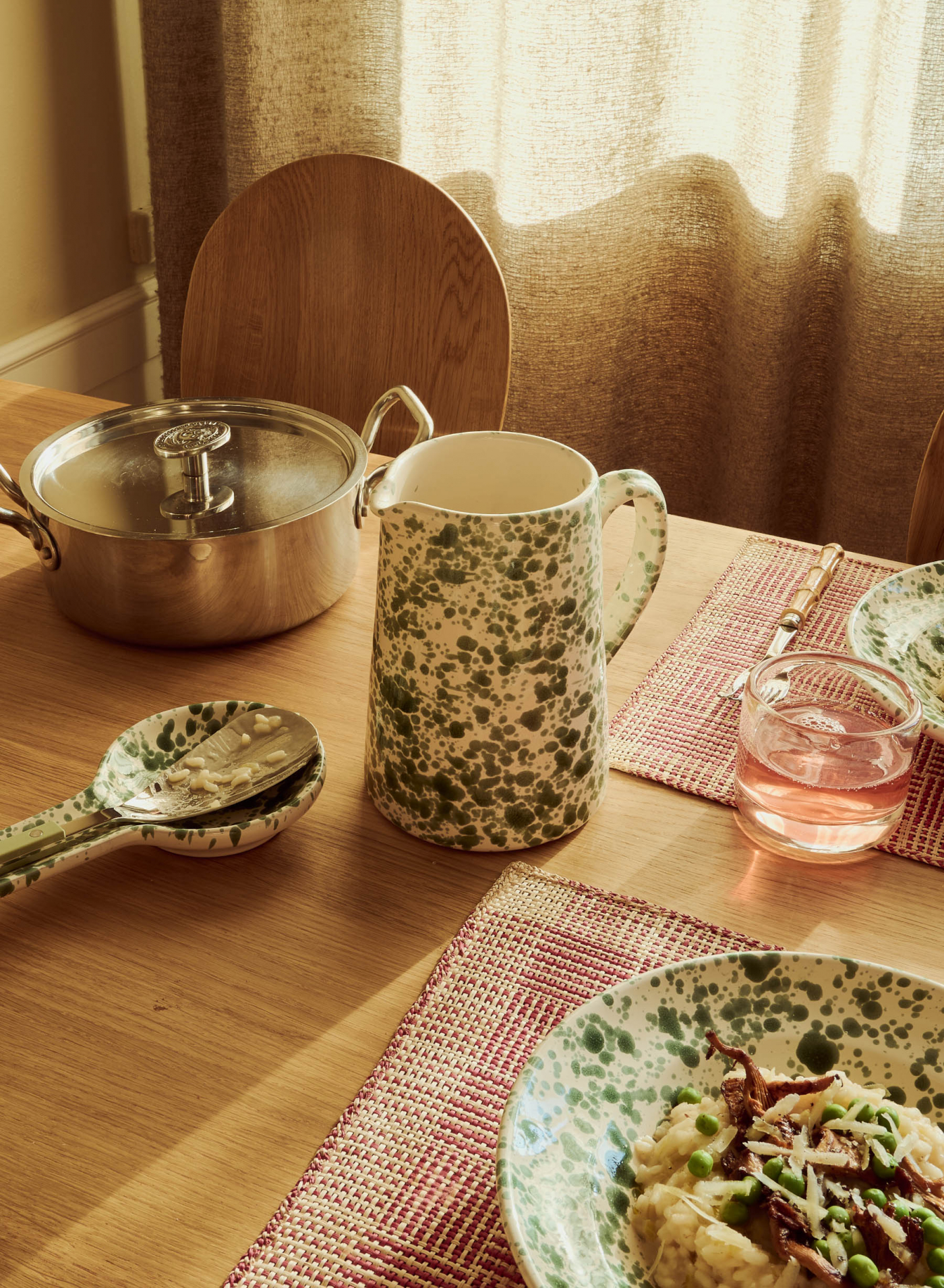"Spruzzi" is an Italian word that means "splash". Splatter-painted pottery is a craft tradition typical of the Puglia region in Italy. This technique involves randomly splattering paint onto the ceramic to give it a unique and individual character. The traditional technique has become an integral part of the region's cultural heritage and represents a long history of ceramics production in the area. Spruzzi Muschio has been splatter-painted in a moss green shade, giving each table setting a lively, colorful, and decorative character.