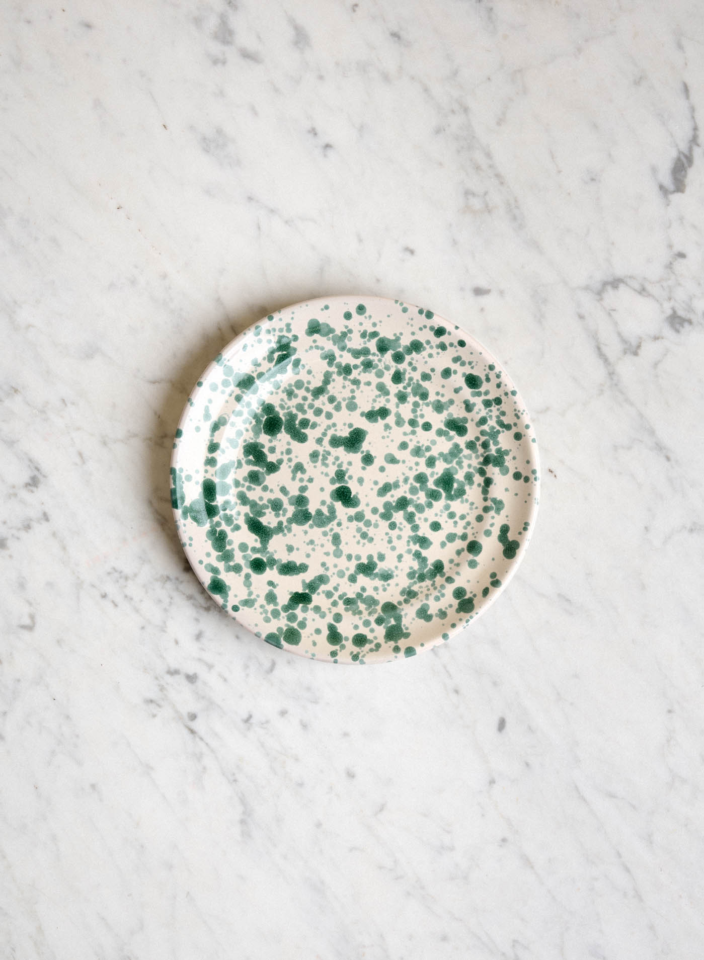 "Spruzzi" is an Italian word that means "splash". Splatter-painted pottery is a craft tradition typical of the Puglia region in Italy. This technique involves randomly splattering paint onto the ceramic to give it a unique and individual character. The traditional technique has become an integral part of the region's cultural heritage and represents a long history of ceramics production in the area. Spruzzi Muschio has been splatter-painted in a moss green shade, giving each table setting a lively, colorful, and decorative character.