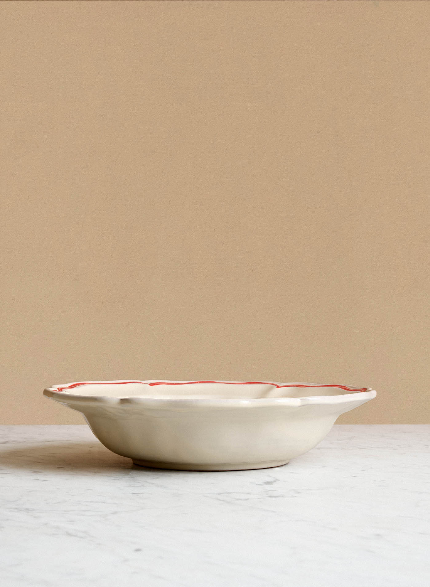 Baccellato Rigio Rosso features a softly scalloped edge with a vibrant red, wide stripe running along its wavy border.