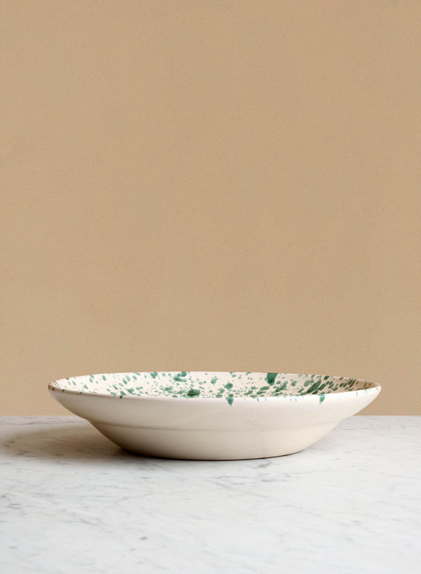 "Spruzzi" is an Italian word that means "splash". Splatter-painted pottery is a craft tradition typical of the Puglia region in Italy. This technique involves randomly splattering paint onto the ceramic to give it a unique and individual character. The traditional technique has become an integral part of the region's cultural heritage and represents a long history of ceramics production in the area. Spruzzi Muschio has been splatter-painted in a moss green shade, giving each table setting a lively, colorful, and decorative character.