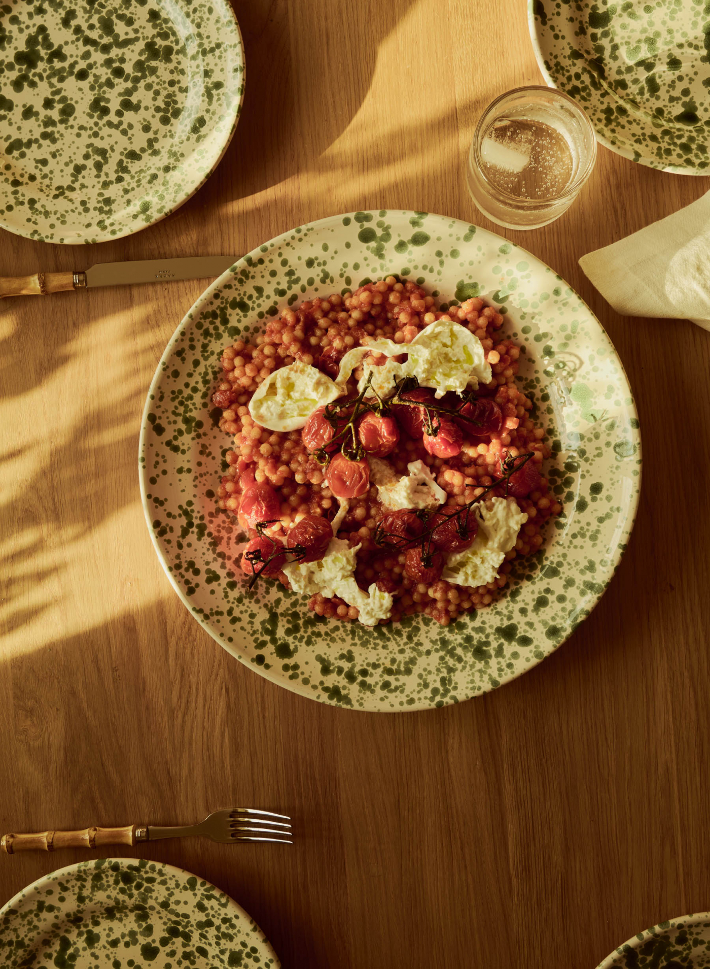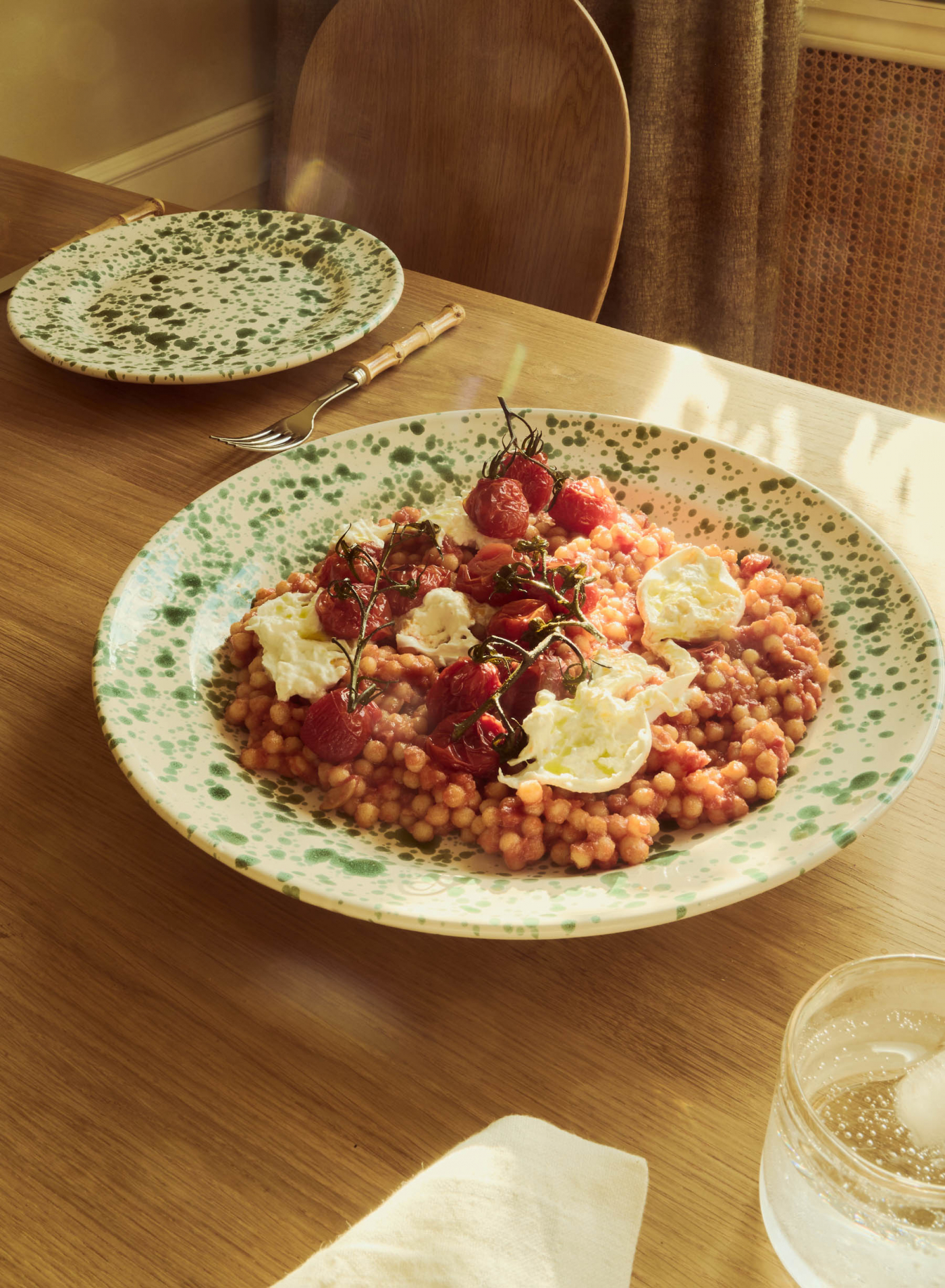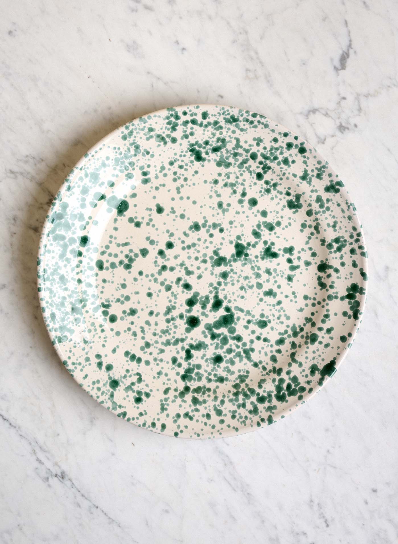 "Spruzzi" is an Italian word that means "splash". Splatter-painted pottery is a craft tradition typical of the Puglia region in Italy. This technique involves randomly splattering paint onto the ceramic to give it a unique and individual character. The traditional technique has become an integral part of the region's cultural heritage and represents a long history of ceramics production in the area. Spruzzi Muschio has been splatter-painted in a moss green shade, giving each table setting a lively, colorful, and decorative character.