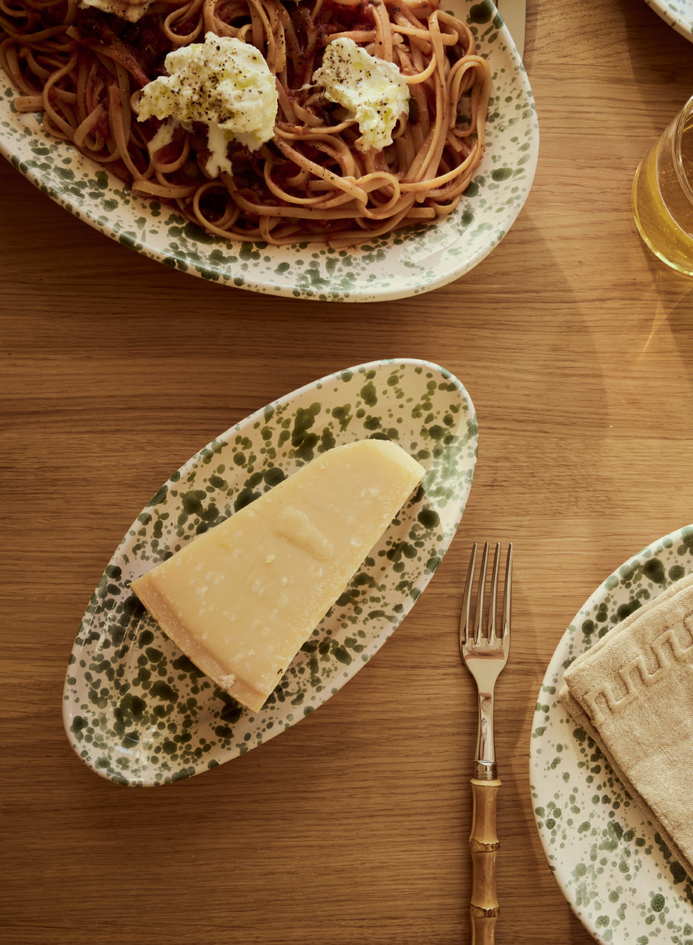 "Spruzzi" is an Italian word that means "splash". Splatter-painted pottery is a craft tradition typical of the Puglia region in Italy. This technique involves randomly splattering paint onto the ceramic to give it a unique and individual character. The traditional technique has become an integral part of the region's cultural heritage and represents a long history of ceramics production in the area. Spruzzi Muschio has been splatter-painted in a moss green shade, giving each table setting a lively, colorful, and decorative character.