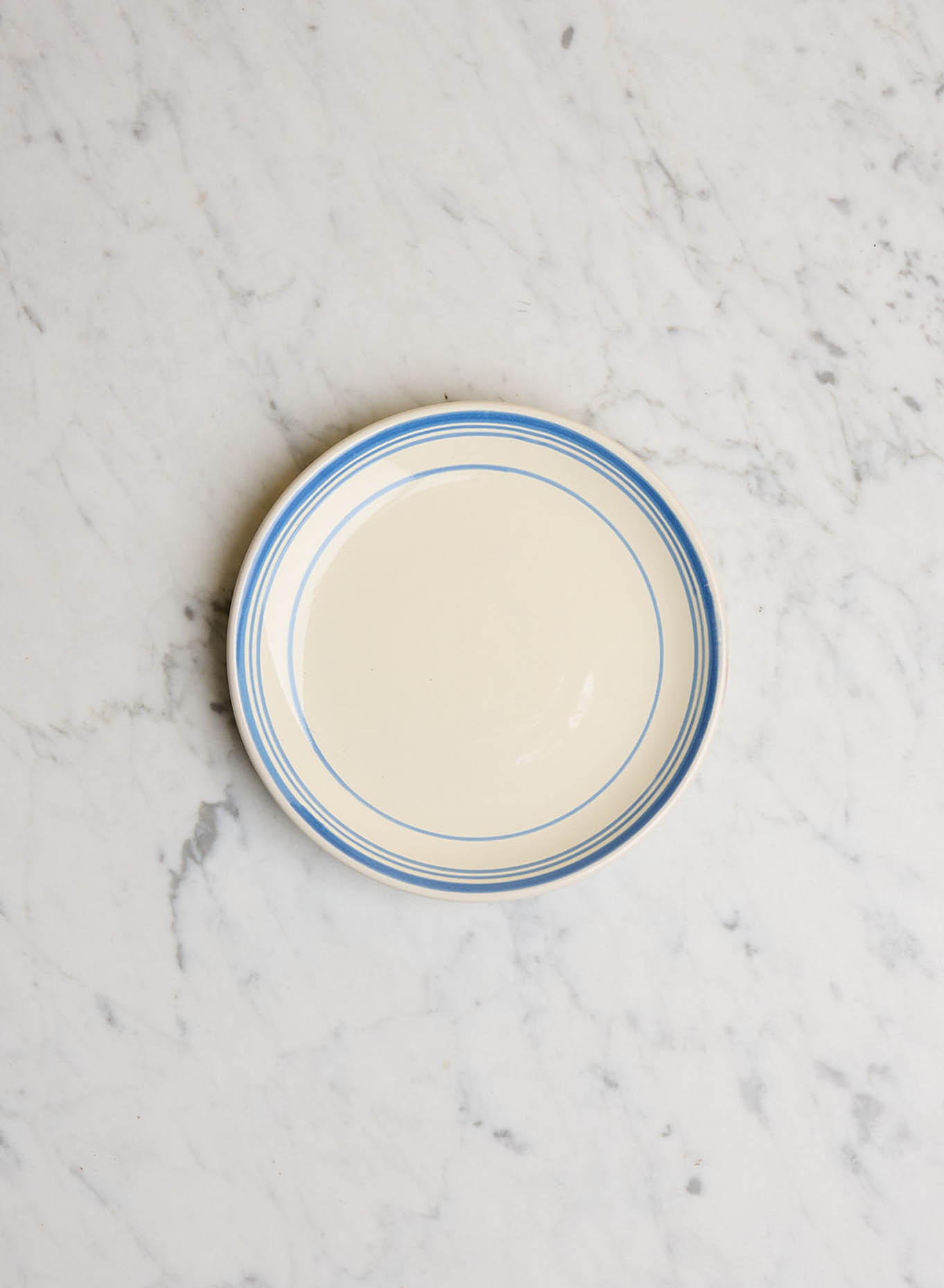 "Decori de Rigio" - adorned with stripes. This classic, bistro-inspired series is hand-painted with four blue lines running around the edge, giving each plate a subtle yet eye-catching accent.