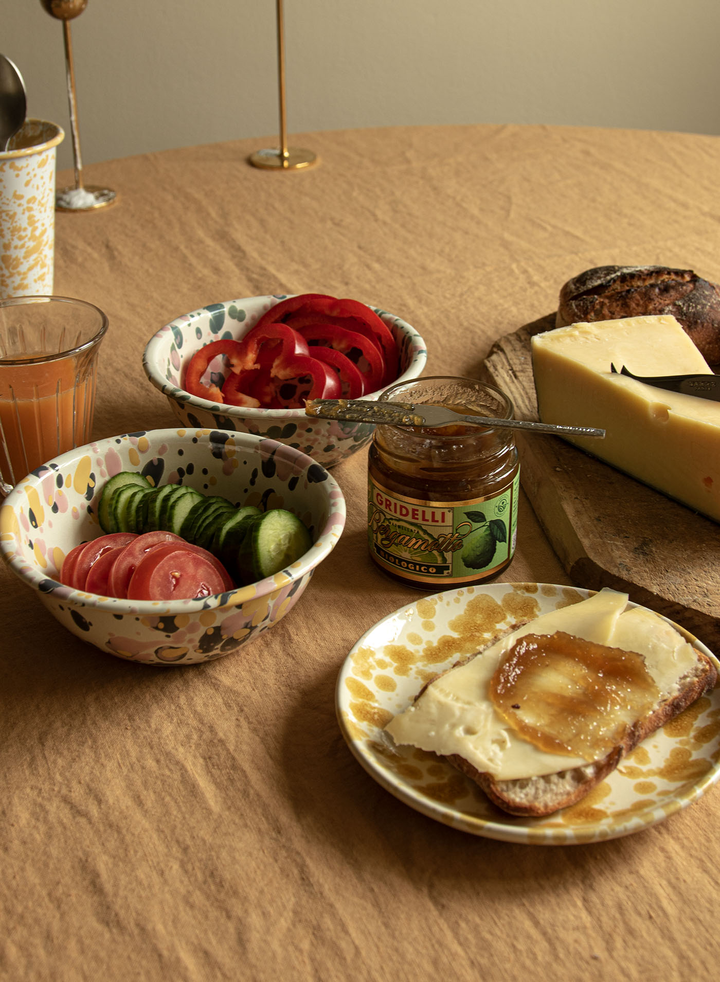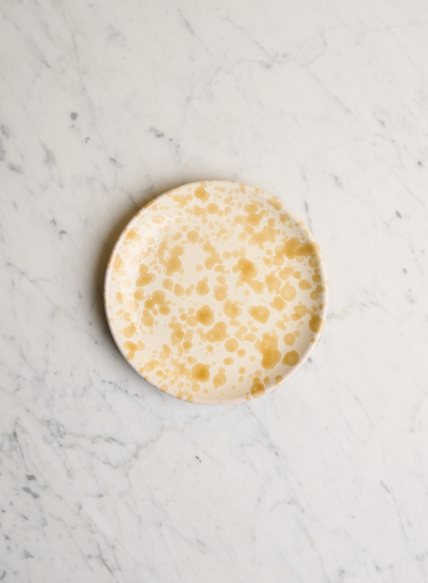 "Spruzzi" is an Italian word that means "splashes" in Swedish. Splatter-painted ceramics are a craft tradition typical of the Puglia region in Italy. This technique involves randomly splashing paint onto the ceramics to give it a unique and individual character. The traditional technique has become an important part of the region’s cultural heritage and represents a long history of ceramic production in the area. Spruzzi Ambra is splatter-painted in a warm, amber-like shade, a rich and deep hue that brings a lively yet warm and elegant character to any table setting.