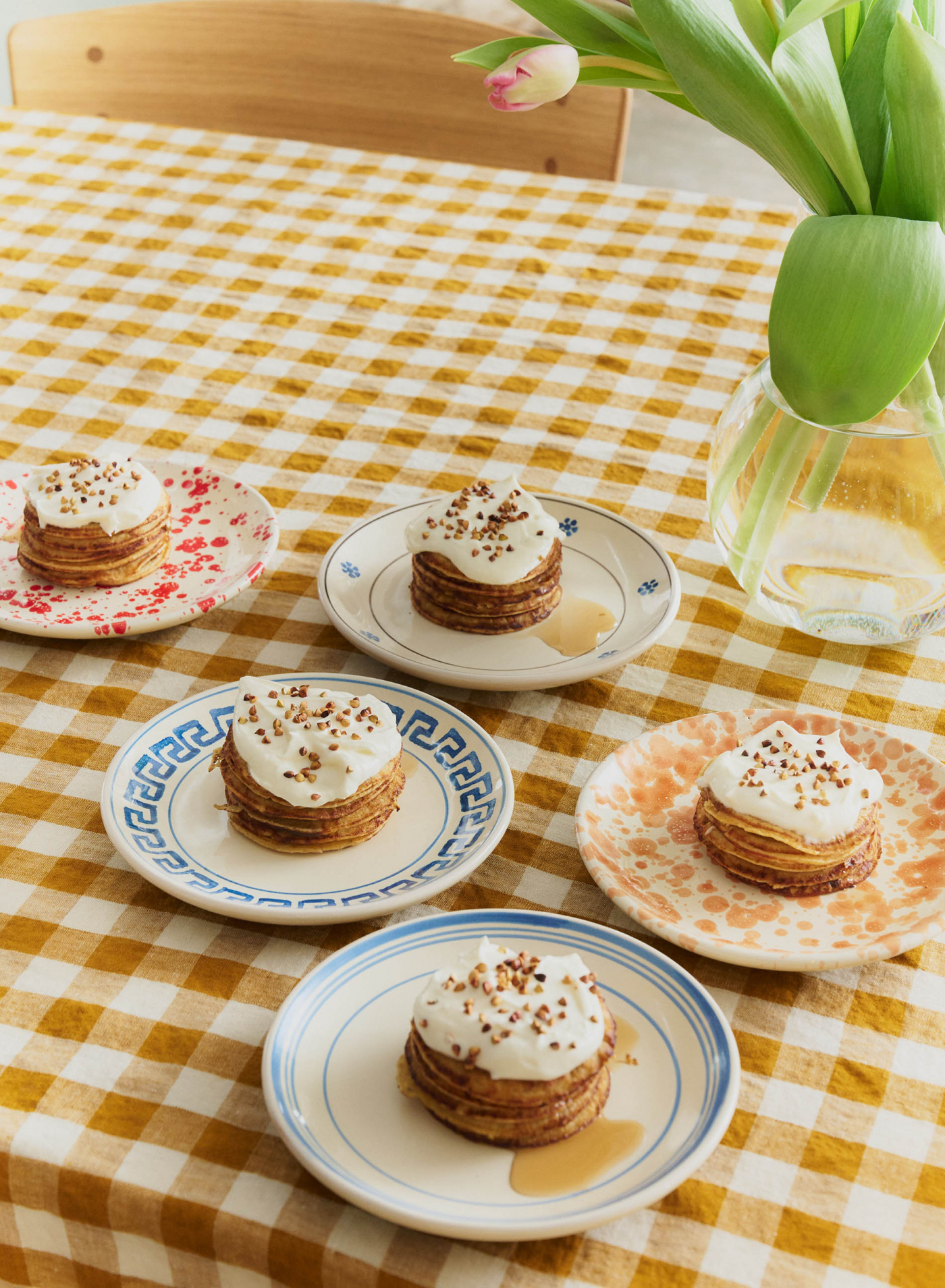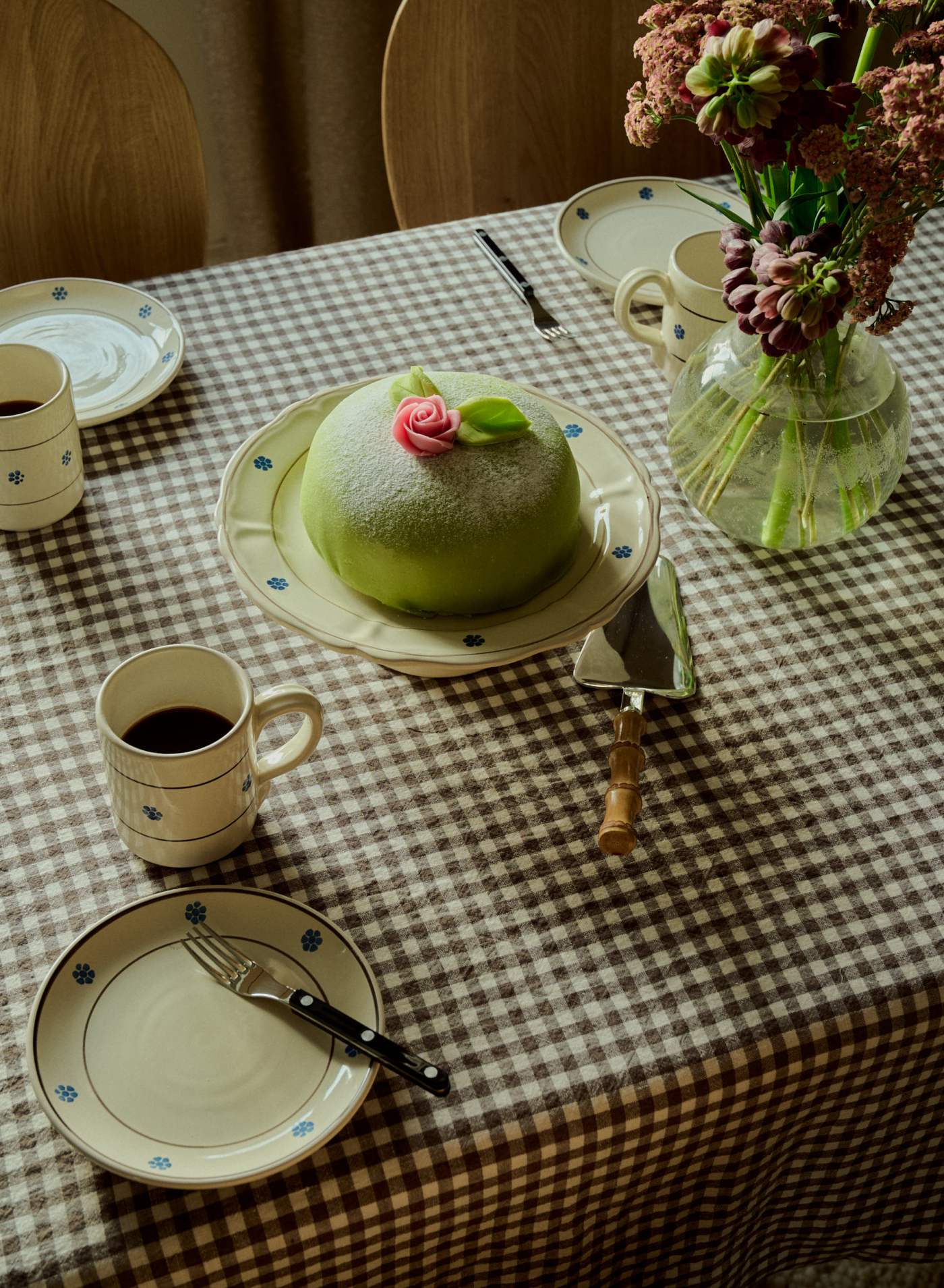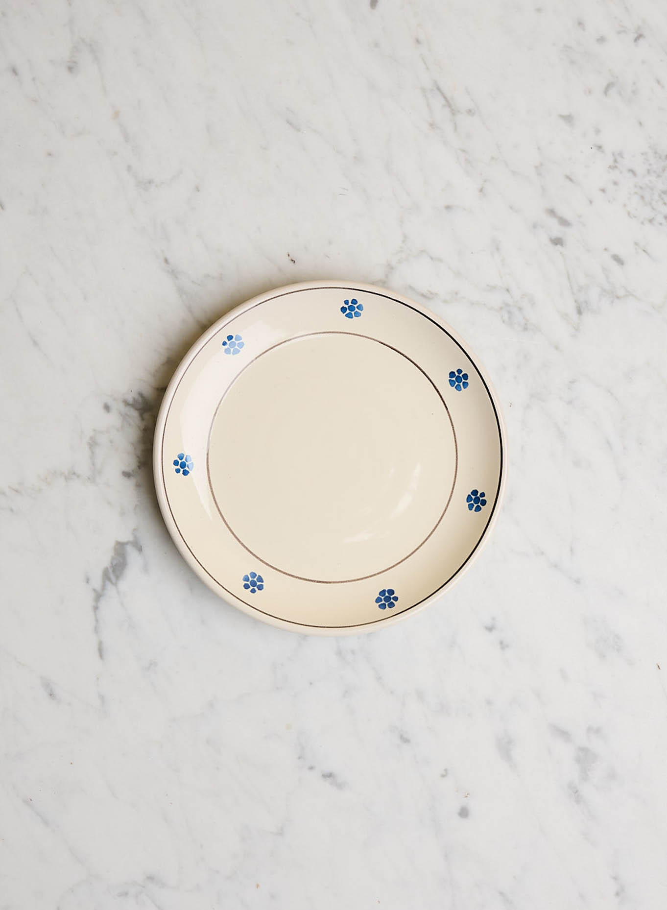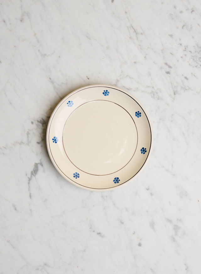 The lines are painted by placing the ceramic on a rotating plate, controlled by a foot pedal, where light brush strokes create delicate lines while the plate rotates. The blue flowers are applied individually with a small stamp. This creates variations that make each detail special. Each plate is unique, with each brushstroke adding a personal touch and creating variations in the design.